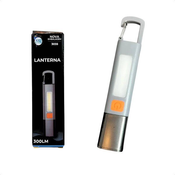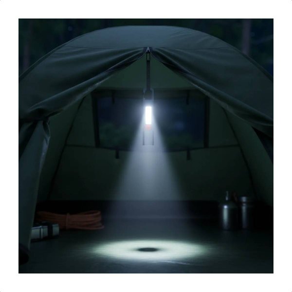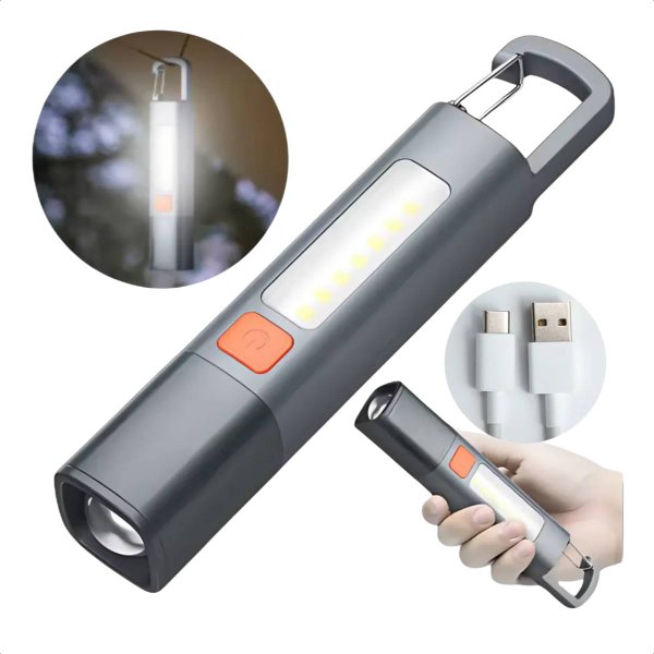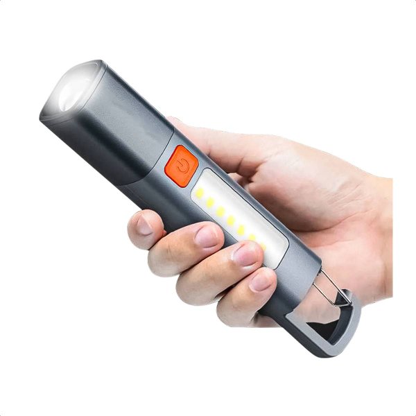 Equipada com LEDs de alto brilho e corpo em material durável, oferece dois tipos de iluminação: foco frontal concentrado e luz lateral ampla tipo bastão, permitindo uso como lanterna de mão ou luminária de apoio. Possui gancho retrátil, facilitando o uso suspenso em barracas, veículos e locais de trabalho.